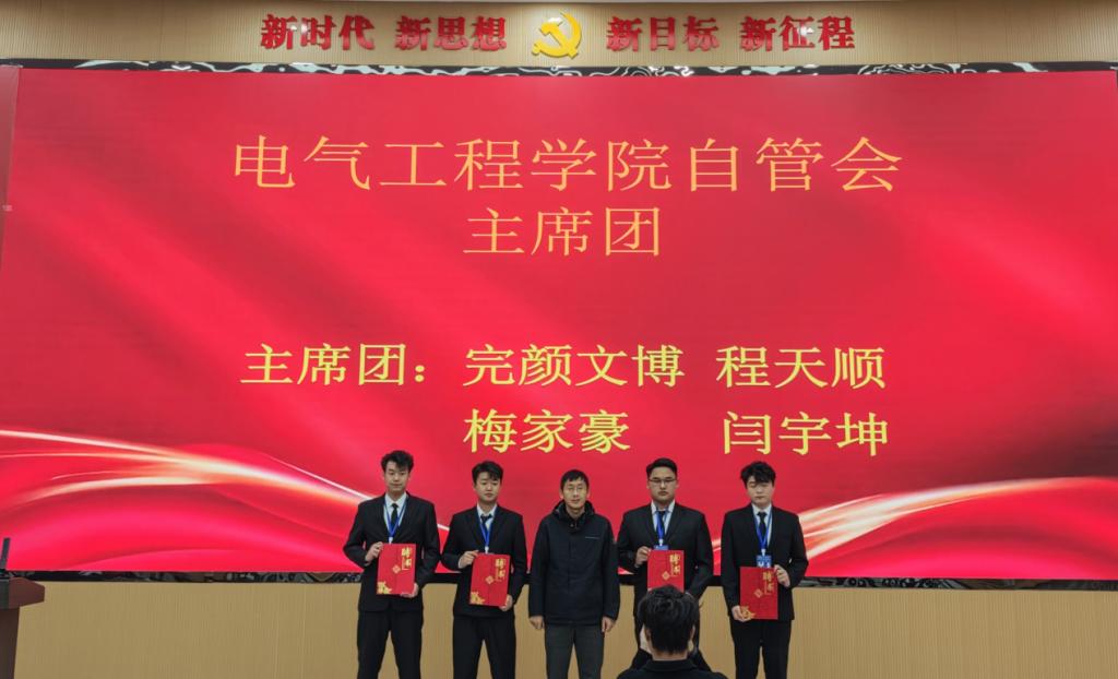电力工程学院党总支负责人轩建举宣读了主席团成员名单。完颜文博、程天顺、梅家豪、闫宇坤四位同学受聘为新一届主席团成员,成为自管会的“领头雁”。轩建举对他们寄予厚望,希望他们以身作则、率先垂范,带领自管会稳步前行。自此,新一届主席团将秉持服务初心,引领团队助力校园建设与发展。