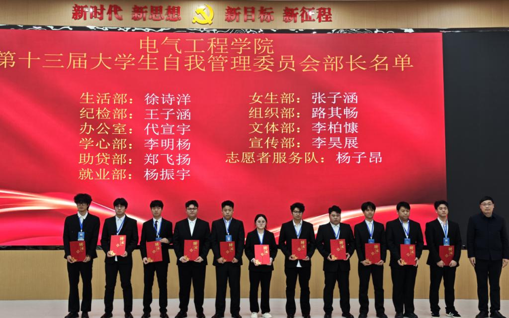 仪式在庄严的国歌声中正式开始。电力工程学院行政负责人杜瑞涛首先宣读了本届自管会各部门副部长名单。来自生活部、纪检部等十余个部门的三十余名同学依次上台,郑重接过聘书,标志着他们正式肩负起服务同学、协助管理的职责。