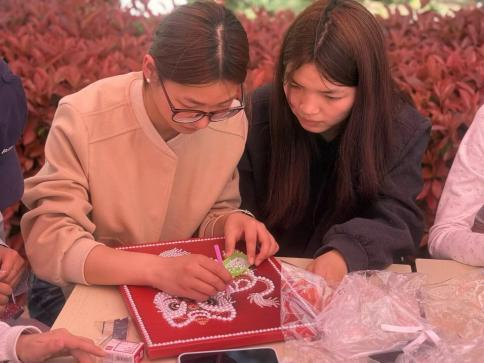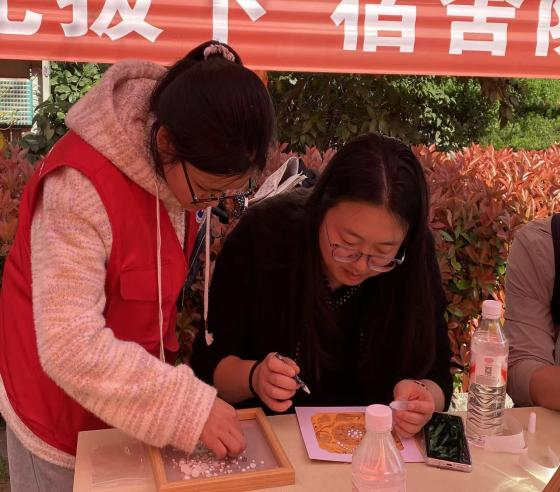 接着,进入了沉浸式的体验环节。同学们手持镊子,小心翼翼地将一颗颗饱满温润的珍珠,精心点缀于宋锦底布之上。不同于传统刺绣的丝线穿梭,珍珠画的制作更考验耐心与专注力。大家屏气凝神,将散落的珍珠巧妙拼接,或成花鸟鱼虫,或作山水意境,皆在指尖缓缓成型。活动现场安静而有序,只有珍珠碰撞的细微声响与同学们专注创作的身影,大家在与非遗材料的指尖对话中,感受着非遗传统工艺独有的宁静与治愈。
