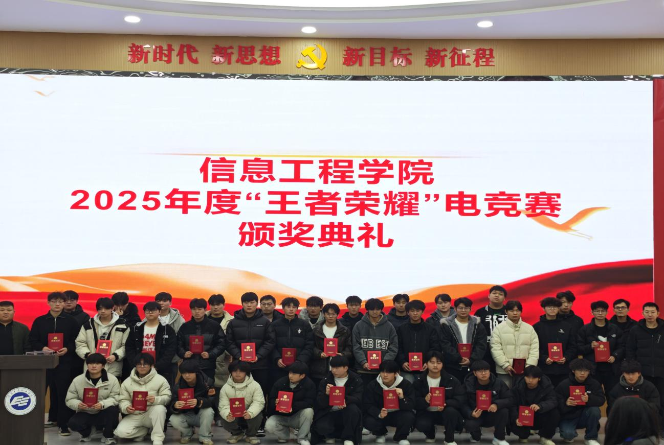 为丰富校园文体生活,提供展示自我的平台,促进校园文化多元化发展,随着信息工程学院王者荣耀电竞赛总冠军战队捧起奖杯,历经数轮比赛圆满落幕。12月30日,信息工程学院在VR思政报告厅举行了2025年“王者荣耀”电竞赛颁奖典礼,信息工程学院团总支书记宋尚霖,信息工程学院自管会指导老师冯子原及学生科教师孙永辉参加此次典礼。