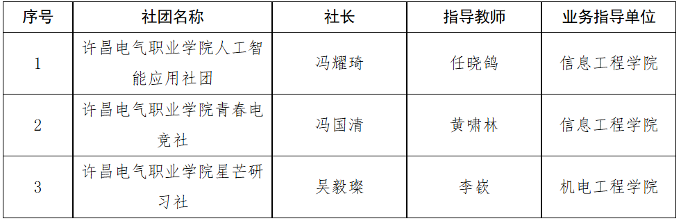 学生社团是落实立德树人根本任务、推进素质教育的重要载体,为充分发挥社团育人功能,促进青年学生德智体美劳全面发展,根据《许昌电气职业学院校级学生社团管理条例》的相关规定,校团委开展了2025-2026学年新社团成立的相关工作。通过各社团筹委会自主申报、业务指导单位审批、资格审查、公开答辩等程序,经答辩评审小组研究,现将拟成立新社团名单公示如下: