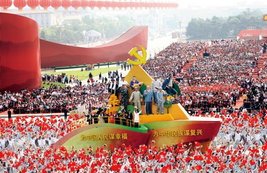 2019年10月1日上午,庆祝中华人民共和国成立70周年大会在北京天安门广场隆重举行。这是群众游行中的“从严治党”方阵。 新华社记者 兰红光/摄