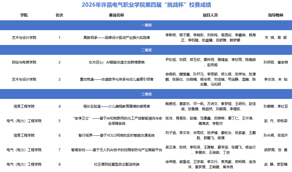 为深入学习贯彻党的二十大精神,落实立德树人根本任务,激发大学生科创热情与实践能力,3月26日,许昌电气职业学院举办第四届“挑战杯”大学生创业计划竞赛校级决赛。本次大赛以“崇尚科学、追求真知、勤奋学习、锐意创新、迎接挑战”为宗旨,引导青年学子将智慧才干融入现实需求。二级学院积极动员、层层筛选,全力指导项目打磨提升。经选拔,共有29支队伍进入校级决赛。