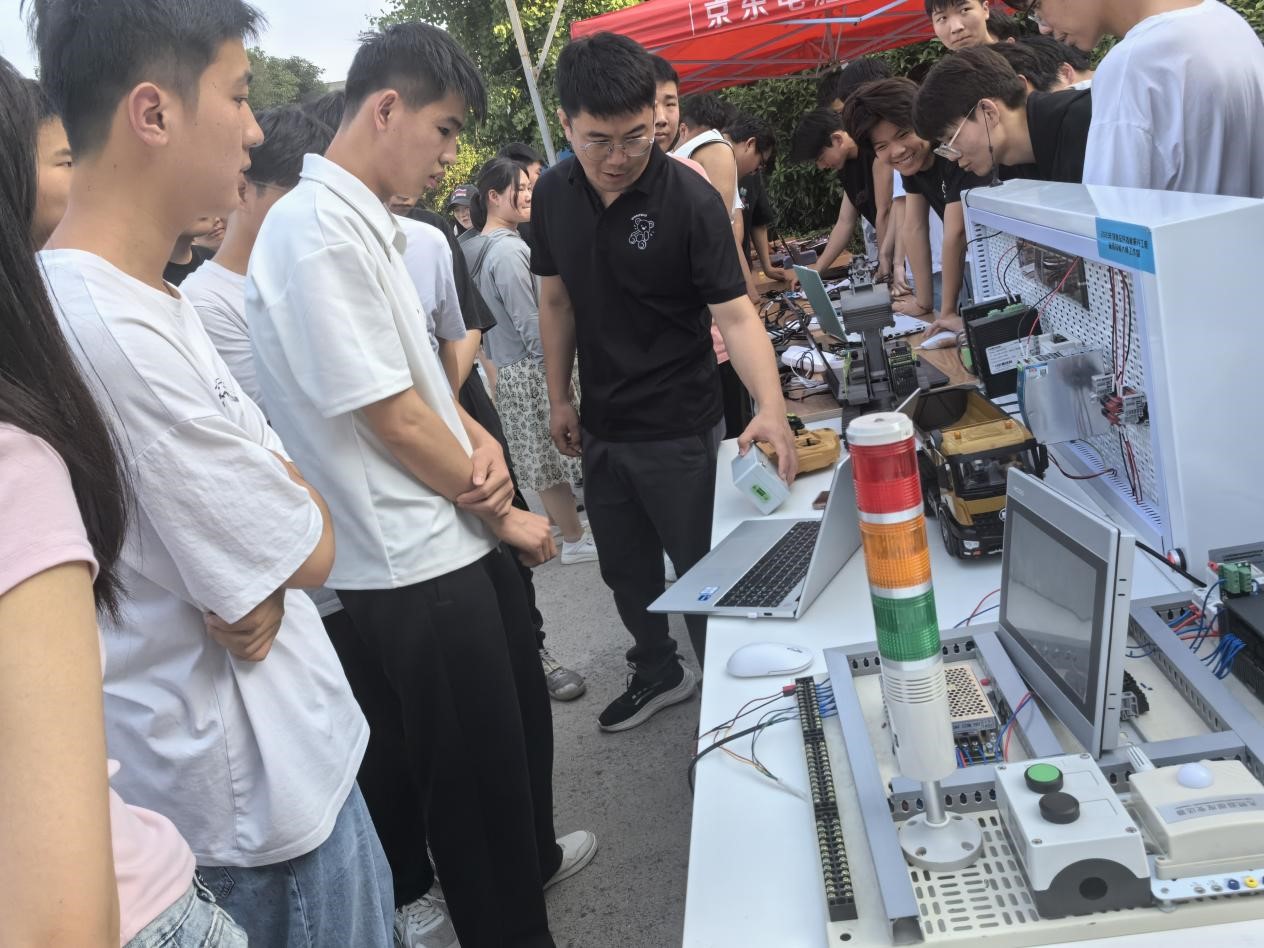 工业互联网是新兴行业,整体行业前景非常巨大,工业互联网展区由王瑞阳、郑栋梁老师负责,由工业互联网应用和电气自动化技术专业学生进行展示,本系统我们开发了LORA终端模块和LORA网关,车辆上安装了终端设备及各种传感器,并通过传感器将温度、GPS、设备倾斜、运行状态、近距离预警等数据,汇集到工业互联网云平台,从而实现对工程车辆设备的监控与管控。活动中,学长们竭尽全力的用所学知识为学弟学妹们进行讲解,现场气氛热烈。