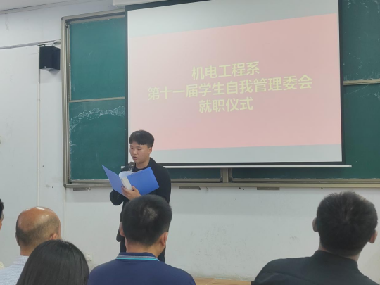 6月12日下午,机电工程系举行第十一届学生自我管理委员会干部任职仪式。系党总支书记刘建刚、主任张红凯、党总支副书记冯振华、副主任王会峰、团总支书记程文浩、院学生处管理科卜伟松以及辅导员老师和外系代表出席。