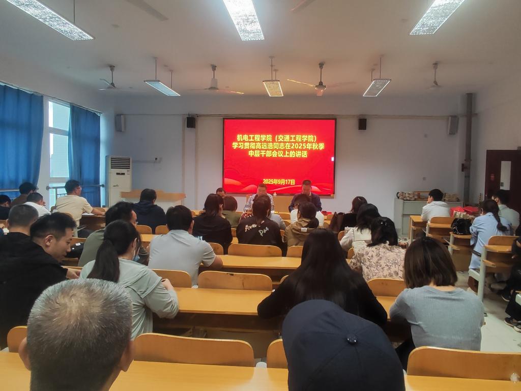 9月17日下午,机电工程学院(交通工程学院)在教A410教室组织召开全体教职工大会,专题学习学院2025年秋季中层干部会议暨教师节庆祝表彰大会上的会议精神。会议由学院负责人冯振华主持,全体教职工参加,为推动新学期各项工作有序推进、落地见效,进一步统一思想、凝聚共识,夯实了基础,提振了精气神。