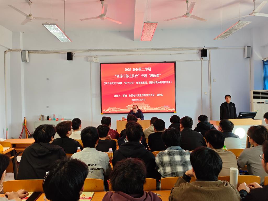 为落实立德树人根本任务,深入推进思想政治教育走深走实,发挥领导干部上讲台思政引领作用,2026年3月27日,学校党委委员、副院长贾楠来到机电工程学院,为学院2026年度入党积极分子、全体学生干部讲授2025-2026学年第二学期专题思政课。本次课程主题为《从百年党史中读懂 “四个自信” 做技能报国、强国有我的新时代青年》,紧扣职教特色,为青年学子带来一堂务实深刻的思政教育课。